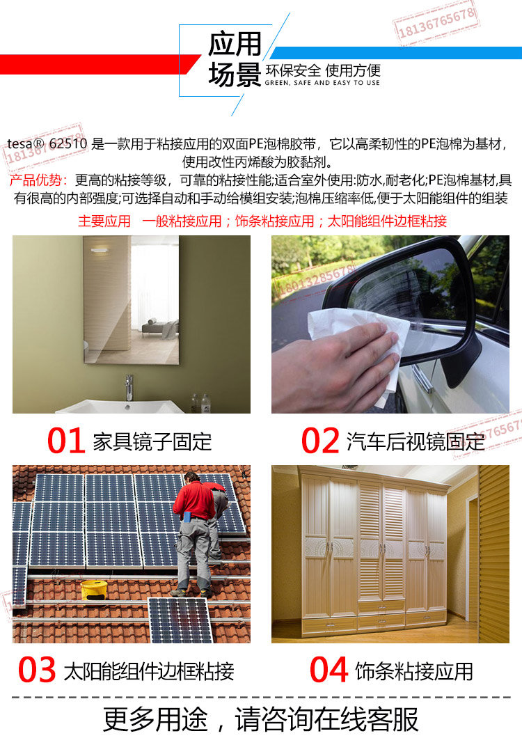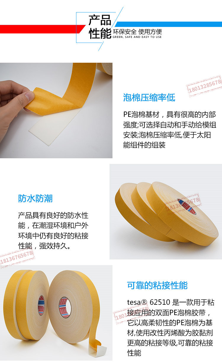 tesa62510/德莎62510泡棉双面胶是一款用于粘接应用的双面PE泡棉胶带,它以高柔韧性的PE泡棉为基材,使用高粘接力的丙烯酸为胶黏剂。极其高的粘接等级,可靠的粘接性能完全适合室外使用:耐紫外,防水,耐老化PE泡棉基材,具有很高的内部强度可选择自动和手动给模组安装泡棉压缩率低,便于太阳能组件的组装一般粘接应用饰条粘