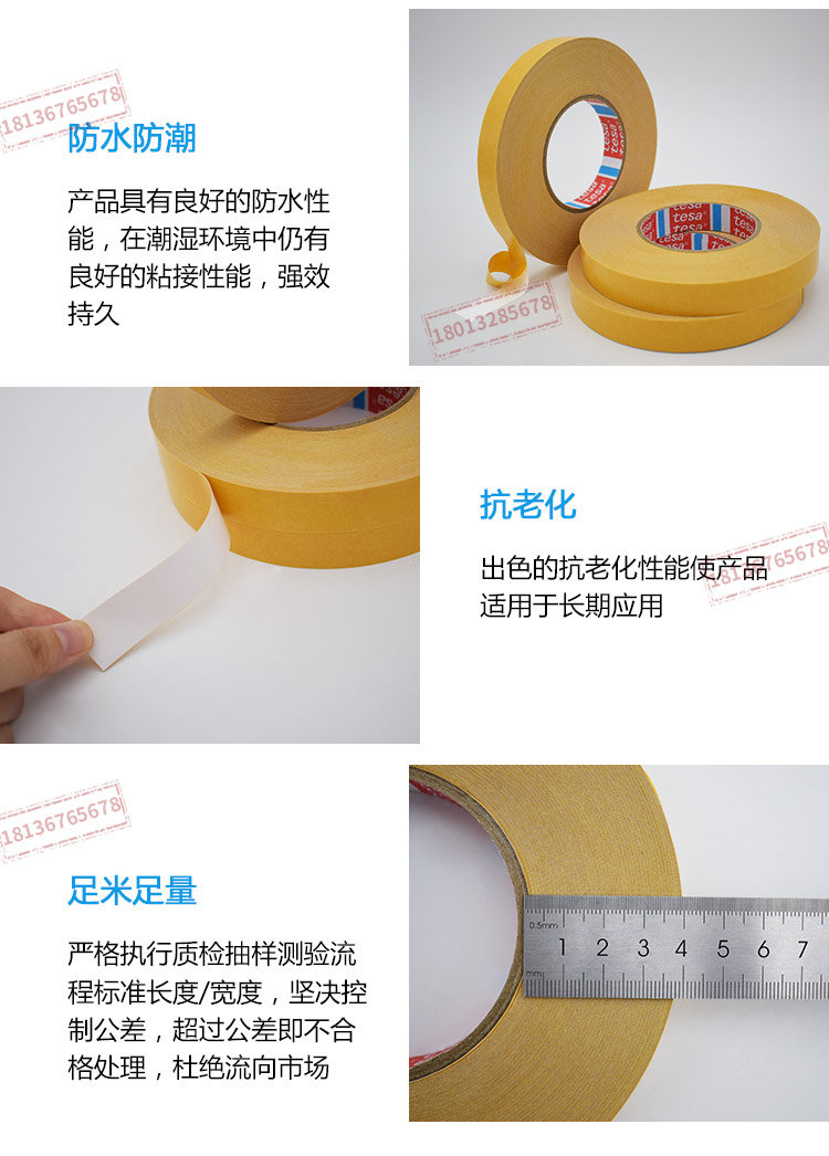 tesa4970双面胶带/德莎4970双面胶带是白色厚双面胶带,由PVC薄膜基材和改性丙烯酸胶系构成。tesa4970特点:优秀的初粘力和立即粘接力较厚的背胶确保即使是在粗糙及不清洁表面仍然具有很好粘接表现完全适用于长期应用技术参数基材PVC(聚氯乙烯)薄膜颜色白色总厚度225µm粘合剂类型改性丙烯酸断裂延展率20%抗张