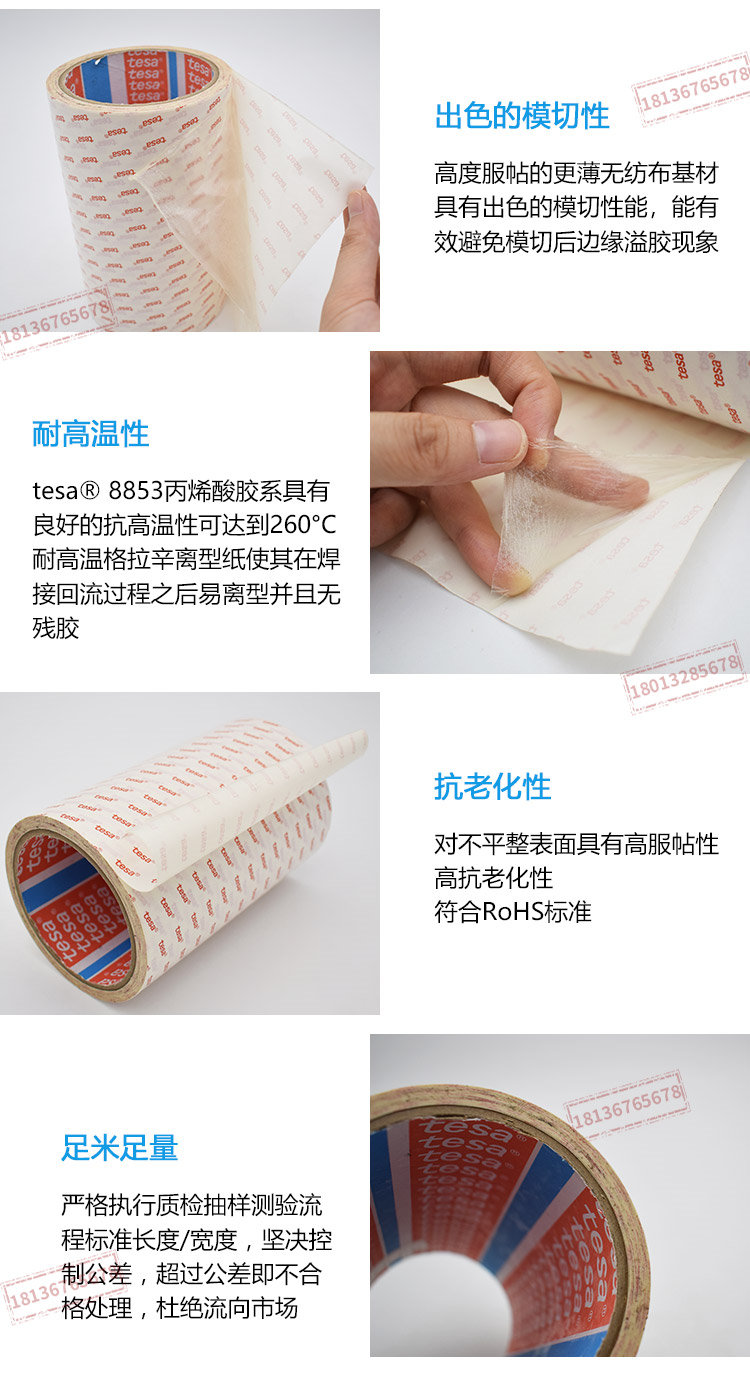 tesa61765 是一款双面自粘性胶带,黑色透明PET基材,改性丙烯酸胶系特性:厚度:100µm高粘贴强度高抗推出力极佳的抗震性能优秀的抗环境性
