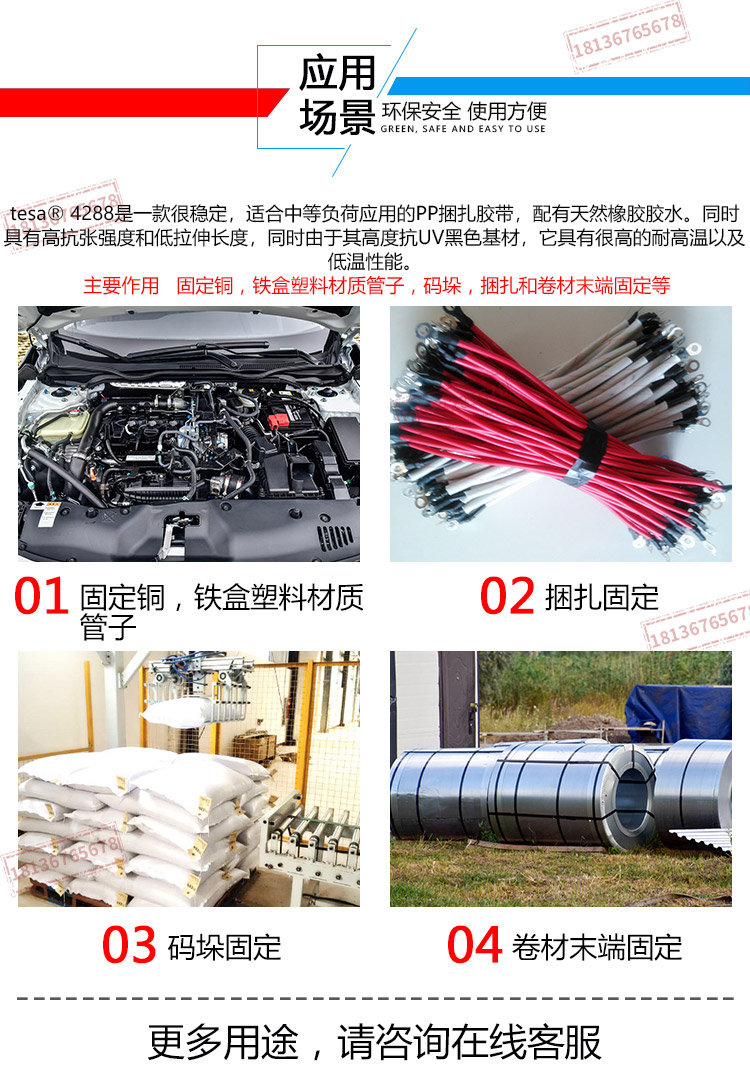 中等负荷强度捆扎胶带tesa4288是一款极其稳定,适合中等负荷应用的PP捆扎胶带,配有天然橡胶胶水。tesa4288同时具有高抗张强度和低拉伸长度,同时由于其高度抗UV黑色基材,它具有很高的耐高温以及低温性能。技术参数基材MOPP(单向聚丙烯)总厚度114 µm粘合剂类型天然橡胶粘接至不锈钢5 N/cm断裂延展率35 %抗张强度300 N/c