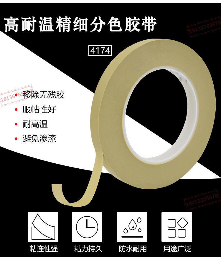 德莎4174PVC分色胶带tesa4174胶带/徳莎4174是柔韧、耐温、橡胶系的精细分色PVC遮蔽胶带,适用于各种高温精细分色胶带遮蔽应用。高温下不收缩油漆烘干过程中,可随被粘物的形变而相应改变形状不翘边、揭除不留残胶对各种不同形状的表面都具有优秀的服帖性技术参数基材PVC(聚氯乙烯)薄膜总厚度110 µm粘合剂类型天然橡胶粘接
