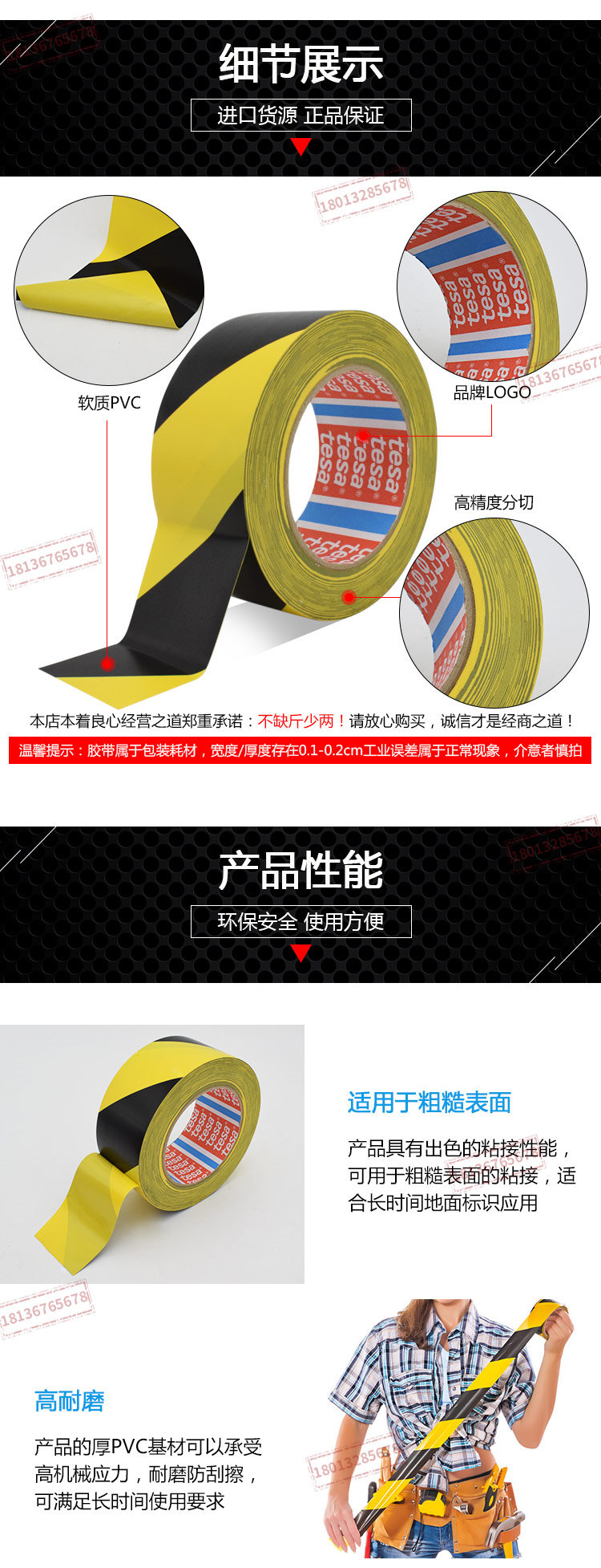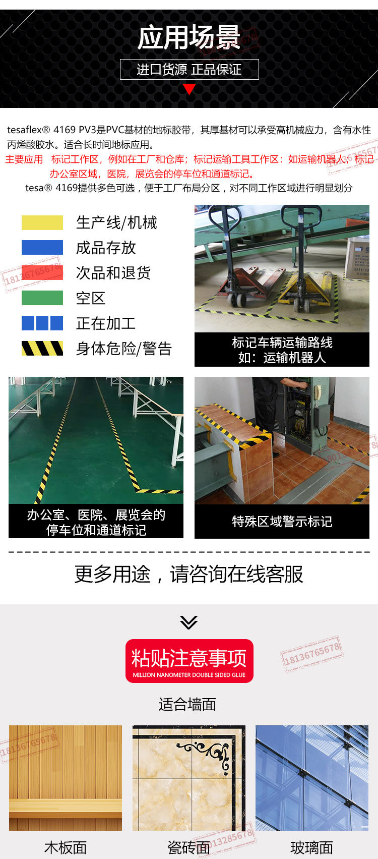 地面标识胶带技术参数基材软质PVC(聚氯乙烯)总厚度180 µm粘合剂类型丙烯酸粘接至不锈钢1.8 N/cm断裂延展率200 %抗张强度30 N/cm标记工作区,例如在工厂和仓库。标记运输工具工作区:如运输机器人。标记办公室区域,医院,展览会的停车位和通道标记。公司名称:昆山钻恒电子科技有限公司联系人 1 :许翠云-18136765678/微