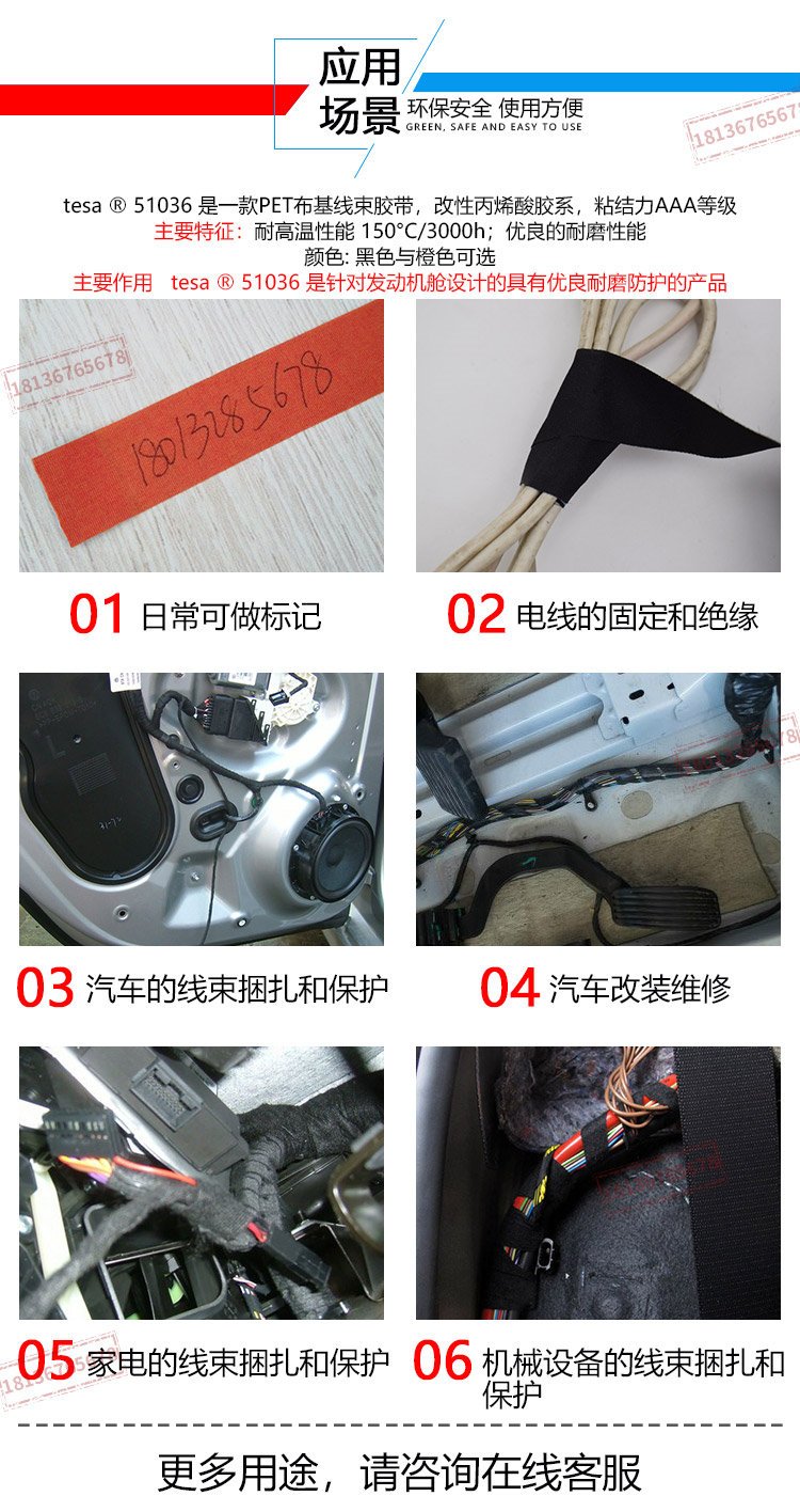 TESA51036 是一款PET布基线束胶带,改性丙烯酸胶系,粘结力AAA等级.主要特征:耐高温性能, 150°C/3000h优良的耐磨性能.技术参数基材PET(聚酯)布基总厚度260 µm粘合剂类型advanced acrylic粘接至不锈钢5 N/cm断裂延展率40 %抗张强度275 N/cm最小耐温-40 °C耐温(3000小时)150 °C耐磨(10mm轴心)Class D (acc. to LV3
