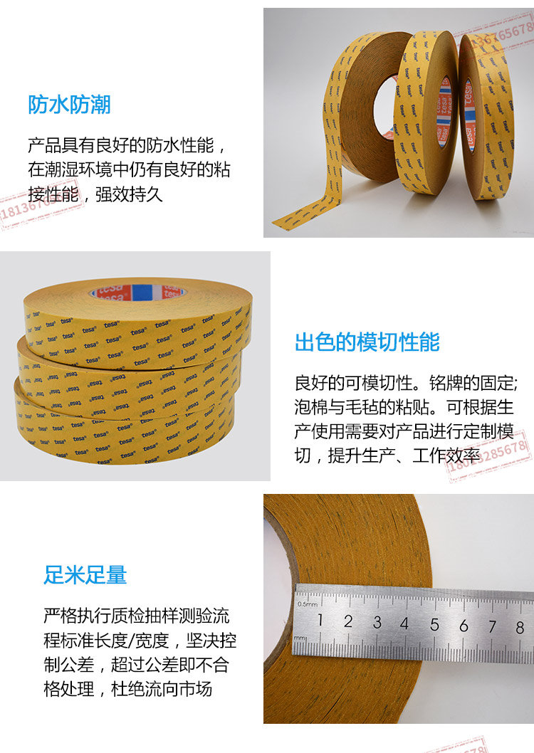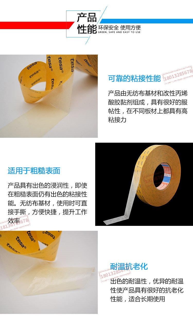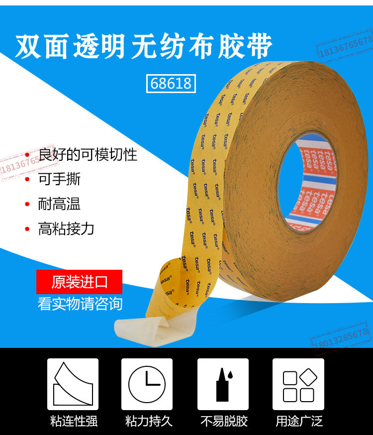 tesa68618是一款以无纺布为基材,使用改性丙烯酸胶水的透明双面胶带。特点在各种泡棉,塑料和金属表面都保持优秀粘接力出色的耐温性易于模切处理粘接至不锈钢(14天后)11 N/cm不锈钢(初始)9 N/cm性质初粘力++23°C静态抗剪切力+一般的粘接固定*固定泡棉与毛毡公司名称:昆山钻恒电子科技有限公司联系人 1 :许翠云-18136