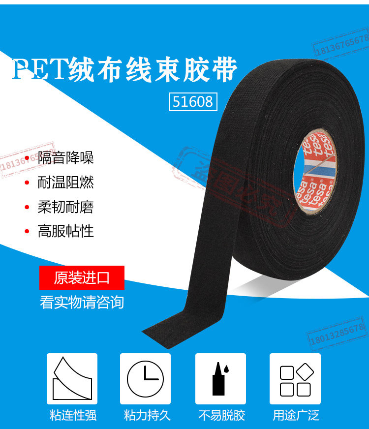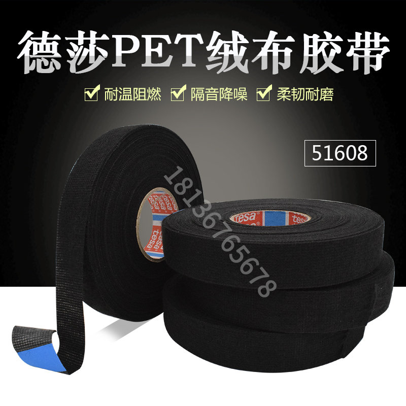 TESA51608是一款PET绒布线束胶带。橡胶胶系.主要特征: * 降噪性能 * 耐磨性能 * 可手撕颜色: 黑色.技术参数基材PET绒布总厚度280 µm粘合剂类型天然橡胶粘接至不锈钢3 N/cm断裂延展率20 %抗张强度40 N/cm最小耐温-40 °C耐温(3000小时)105 °C耐磨(10mm轴心)Class B (acc. to LV312)耐磨(5mm轴心)Class A (acc. to LV