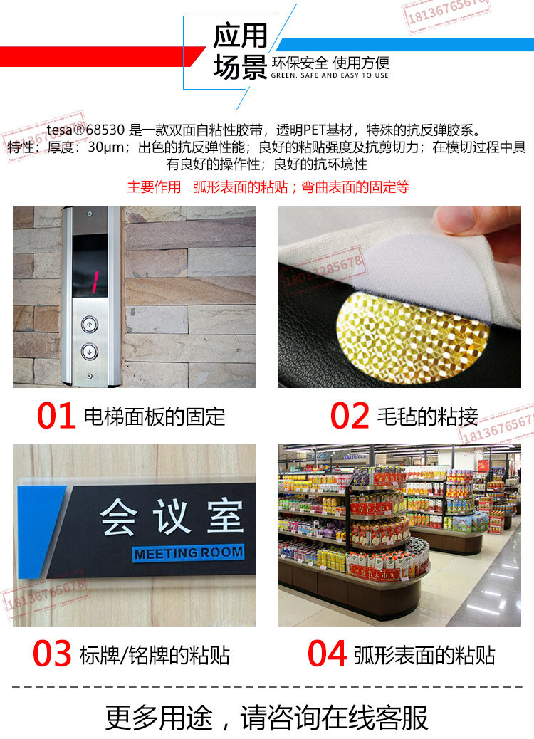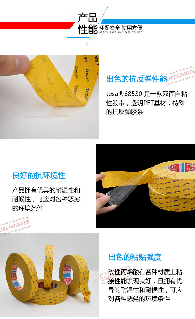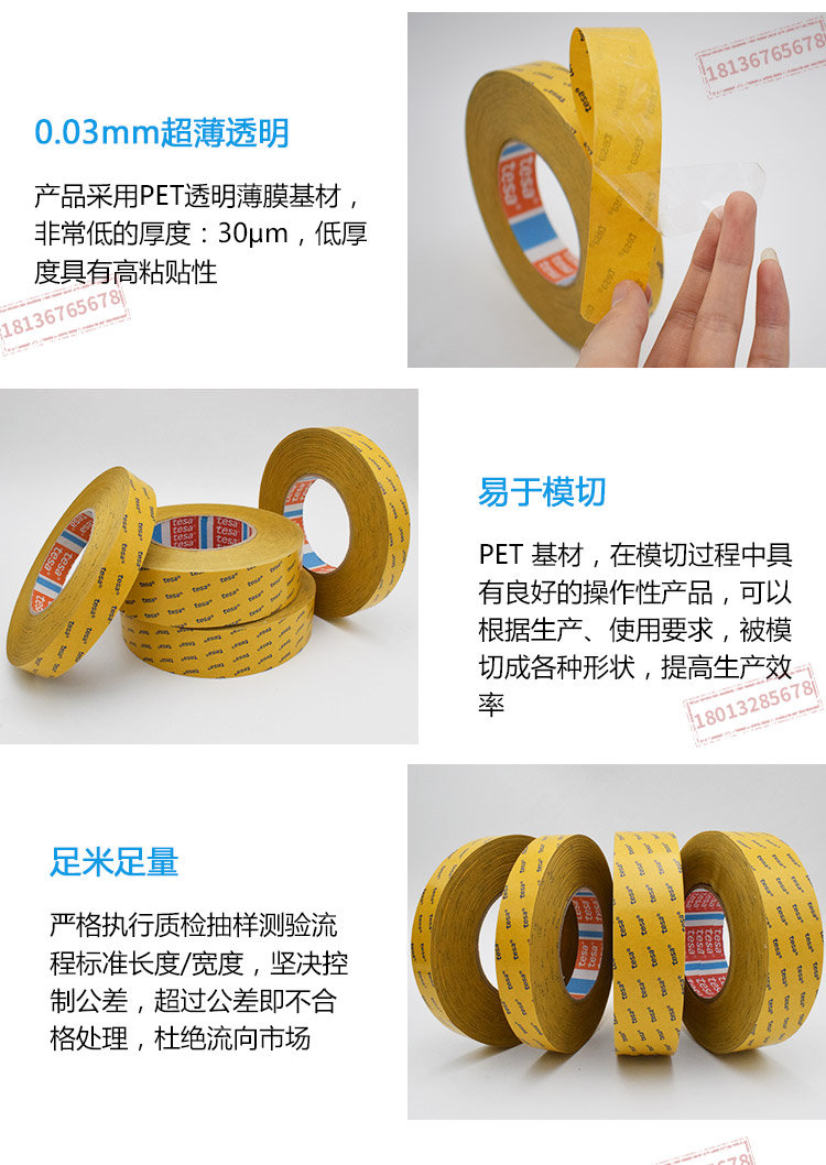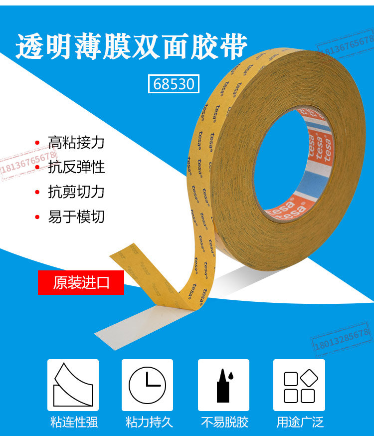 tesa68530 是一款双面自粘性胶带,透明PET基材,特殊的抗反弹胶系。tesa68530 特性:厚度:30μm优秀的抗反弹性能优秀的粘贴强度及抗剪切力在模切过程中具有良好的操作性技术参数基材PET(聚酯)薄膜颜色透明总厚度30 µm粘合剂类型改性丙烯酸离型纸类型玻璃纤维纸离型纸颜色白/红色商标离型纸厚度71 µm离型纸重量82 g/m²