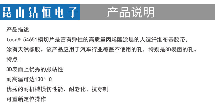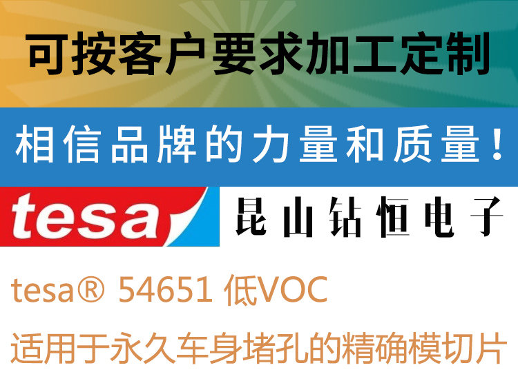 昆山钻恒电子科技有限公司座落于中国经济最发达的长江三角洲-昆山,专业致力于胶粘制品的研发,生产,加工,销售为一体,能第一时间为客户提供专业化的胶粘解决方案,主营tesa胶带,德莎胶带,双面泡棉胶带,绒布胶带,汽车遮蔽胶带,PVC分色胶带,耐高温胶带,透气胶带。