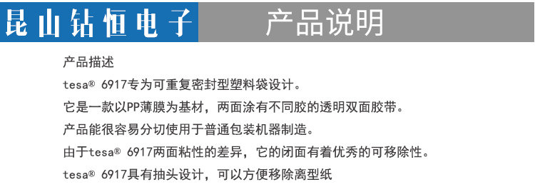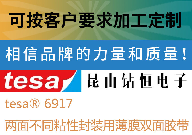 昆山钻恒电子科技有限公司座落于中国经济最发达的长江三角洲-昆山,专业致力于胶粘制品的研发,生产,加工,销售为一体,能第一时间为客户提供专业化的胶粘解决方案,主营tesa胶带,德莎胶带,双面泡棉胶带,绒布胶带,汽车遮蔽胶带,PVC分色胶带,耐高温胶带,透气胶带。
