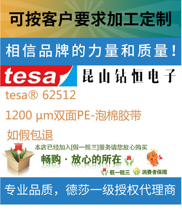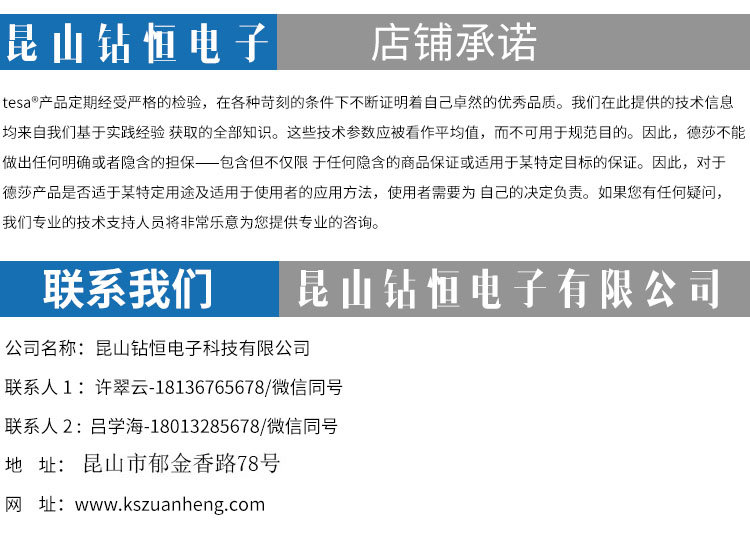 昆山钻恒电子科技有限公司座落于中国经济最发达的长江三角洲-昆山,专业致力于胶粘制品的研发,生产,加工,销售为一体,能第一时间为客户提供专业化的胶粘解决方案,主营tesa胶带,德莎胶带,双面泡棉胶带,绒布胶带,汽车遮蔽胶带,PVC分色胶带,耐高温胶带,透气胶带。
