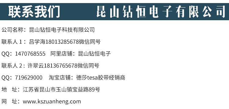 昆山钻恒电子科技有限公司座落于中国经济最发达的长江三角洲-昆山,专业致力于胶粘制品的研发,生产,加工,销售为一体,能第一时间为客户提供专业化的胶粘解决方案,主营tesa胶带,德莎胶带,双面泡棉胶带,绒布胶带,汽车遮蔽胶带,PVC分色胶带,耐高温胶带,透气胶带。