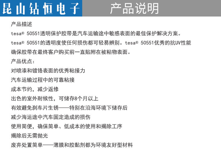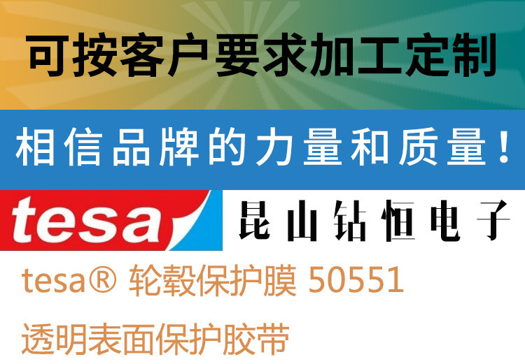 昆山钻恒电子科技有限公司座落于中国经济最发达的长江三角洲-昆山,专业致力于胶粘制品的研发,生产,加工,销售为一体,能第一时间为客户提供专业化的胶粘解决方案,主营tesa胶带,德莎胶带,双面泡棉胶带,绒布胶带,汽车遮蔽胶带,PVC分色胶带,耐高温胶带,透气胶带。