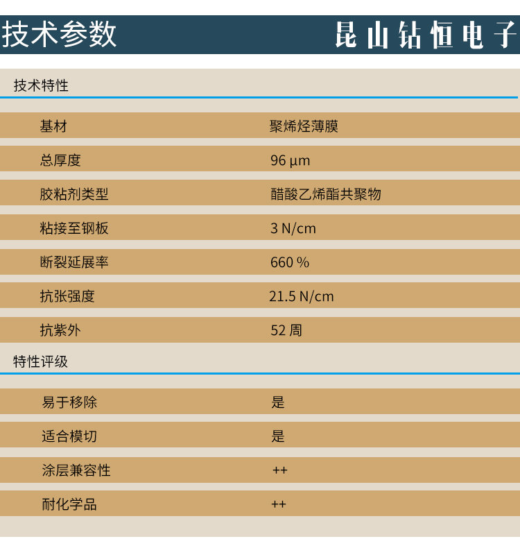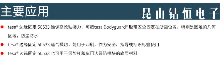 昆山钻恒电子科技有限公司座落于中国经济最发达的长江三角洲-昆山,专业致力于胶粘制品的研发,生产,加工,销售为一体,能第一时间为客户提供专业化的胶粘解决方案,主营tesa胶带,德莎胶带,双面泡棉胶带,绒布胶带,汽车遮蔽胶带,PVC分色胶带,耐高温胶带,透气胶带。