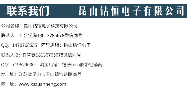 昆山钻恒电子科技有限公司座落于中国经济最发达的长江三角洲-昆山,专业致力于胶粘制品的研发,生产,加工,销售为一体,能第一时间为客户提供专业化的胶粘解决方案,主营tesa胶带,德莎胶带,双面泡棉胶带,绒布胶带,汽车遮蔽胶带,PVC分色胶带,耐高温胶带,透气胶带。