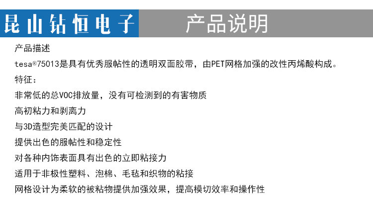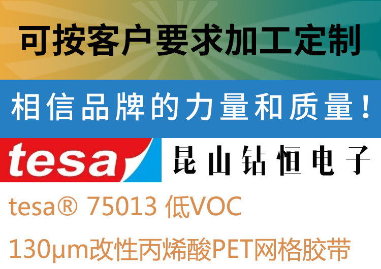 昆山钻恒电子科技有限公司座落于中国经济最发达的长江三角洲-昆山,专业致力于胶粘制品的研发,生产,加工,销售为一体,能第一时间为客户提供专业化的胶粘解决方案,主营tesa胶带,德莎胶带,双面泡棉胶带,绒布胶带,汽车遮蔽胶带,PVC分色胶带,耐高温胶带,透气胶带。