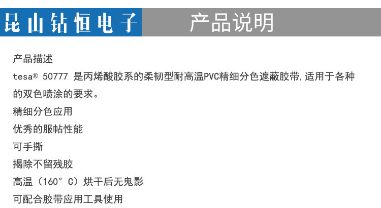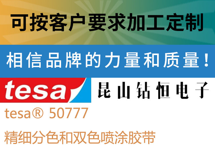 昆山钻恒电子科技有限公司座落于中国经济最发达的长江三角洲-昆山,专业致力于胶粘制品的研发,生产,加工,销售为一体,能第一时间为客户提供专业化的胶粘解决方案,主营tesa胶带,德莎胶带,双面泡棉胶带,绒布胶带,汽车遮蔽胶带,PVC分色胶带,耐高温胶带,透气胶带。