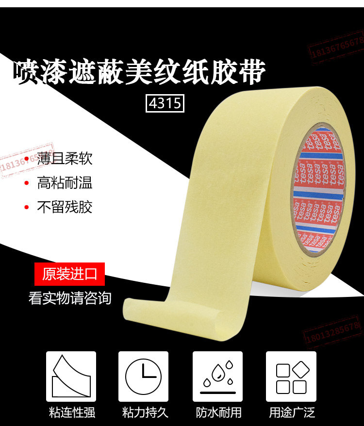 产品描述tesa®4316细皱纹纸胶带薄且柔软,适用于各种通用的喷漆遮蔽应用,同时也适用于100ºC高温下的烘干应用。主要应用产品耐湿磨 ,涂料或油漆能很好地附着于基材表面 。适用于喷漆金属,橡胶,玻璃 和镀铬部件表面公司名称;昆山钻恒电子科技有限公司 联系人:许小姐 手机:181367656